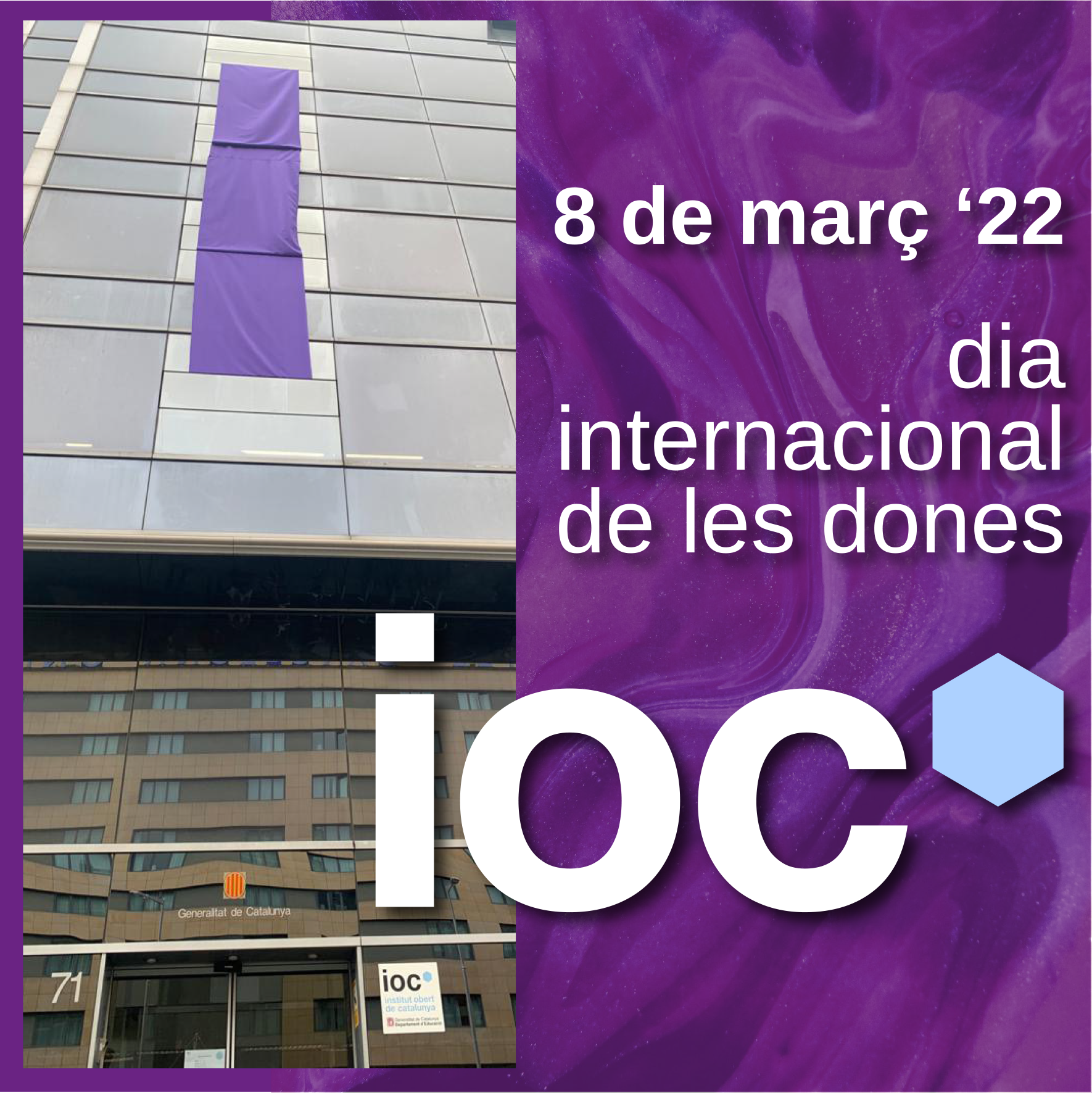 Avui, 8 de març del 2022, des de l’Institut Obert de Catalunya hem commemorat el Dia internacional de la dones i per fer-ho, hem desplegat una tela a la façana de l’edifici i hem realitzant un seguit d’activitats que detallem a continuació: