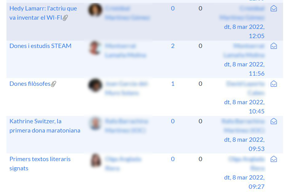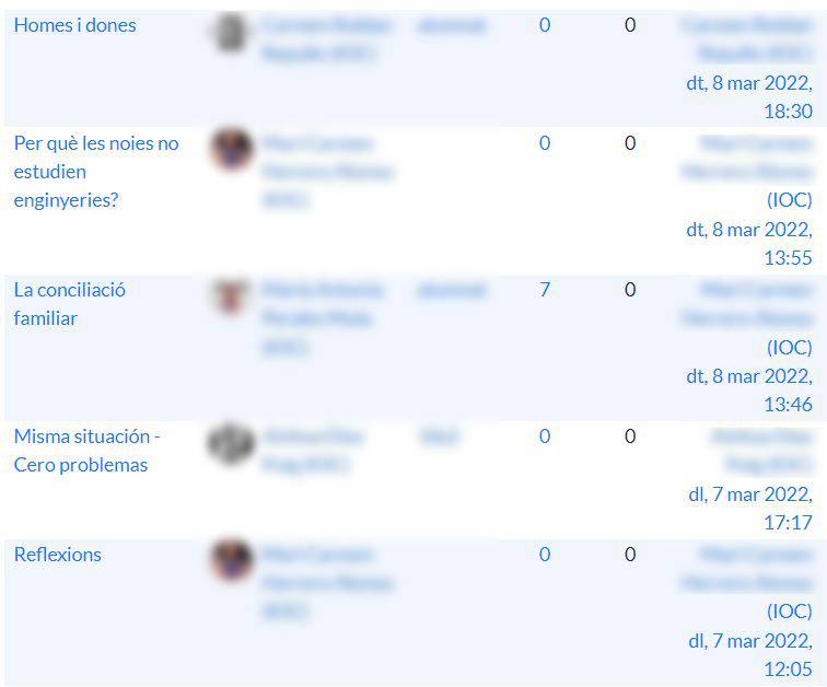• En cadascun dels estudis s’ha obert un fòrum titulat:  Sabies que….?  L’objectiu d’aquest és ajudar-nos a prendre consciència que encara queda molt camí per recórrer. Per tractar de donar visibilitat a alguns fets que ens passen desapercebuts i que evidencien que les dones continuem patint discriminació.