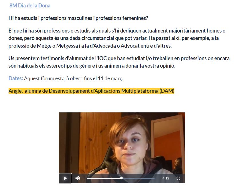 • Dins l’aula Atenció a l’estudiant / Comunitat FP també s’ha obert un altre fòrum titulat: Trenquem estereotips. On es presenten testimonis d’alumnat de FP de l’IOC que han estudiat i/o treballen en professions on encara són habituals els estereotips de gènere.