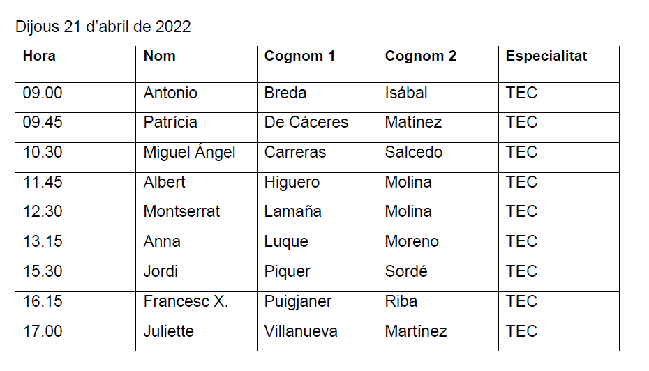 Cada persona convocada és suplent de la persona anterior, excepte la primera persona convocada del dia, que no és suplent de l’última del dia anterior.